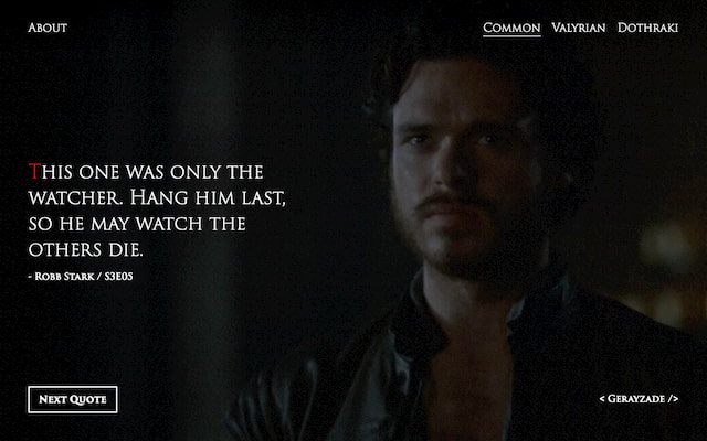 Fan project by me which generates a random quote from Game of Thrones TV series in several fictional languages.
